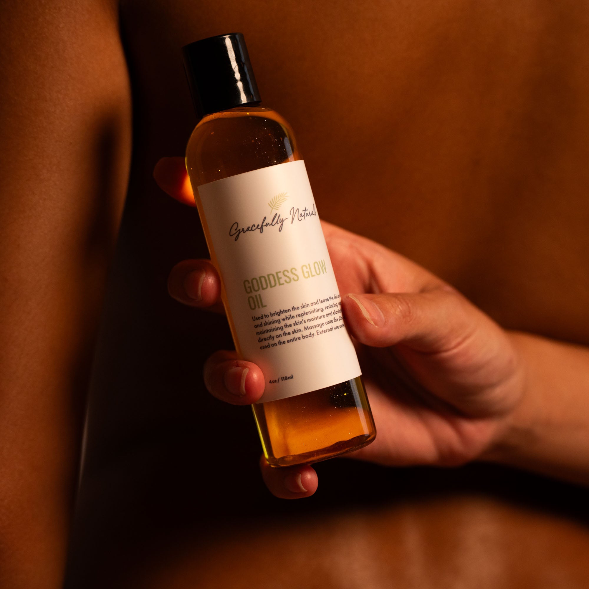 The Goddess Glow Oil Body Shimmer was meticulously blended with Vitamins A, E, antioxidants, and essential fatty acids to allow you to feel beautiful and glowing with an even skin tone and a finishing sheen. The Goddess Glow is a body oil blended to help improve the skin’s health and glow while enveloping the body in a light, decadent aroma. Goddess Glow is infused with shimmer that leaves the body sparkling all day long. The oils in this blend will replenish the missing moisture in the skin and retain that hydration throughout the entirety of the day. Like our other multi-use body oils, this oil can be used as a body or massage oil, applied to the hair, or added to the bath to create a spa experience in the comfort of your own home.