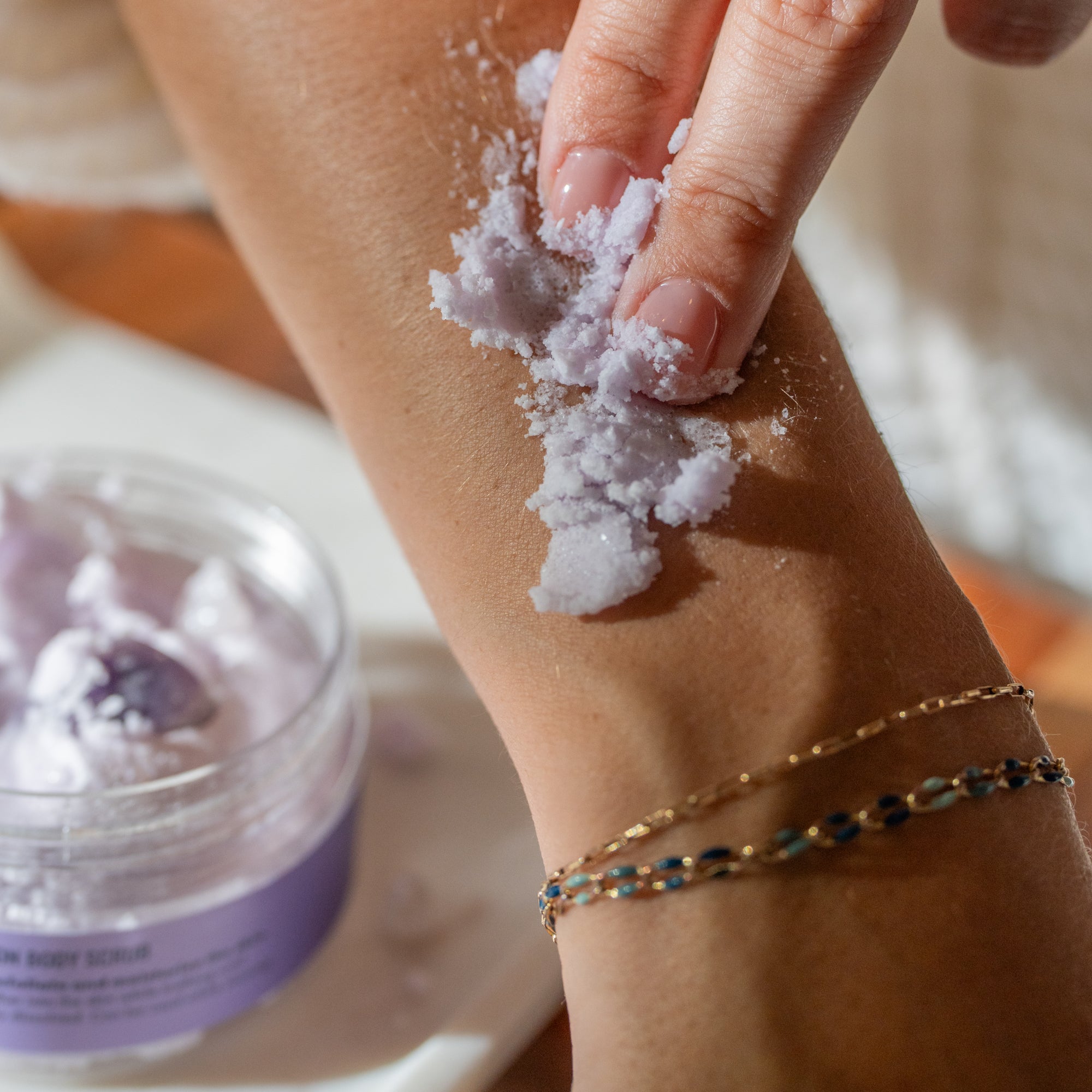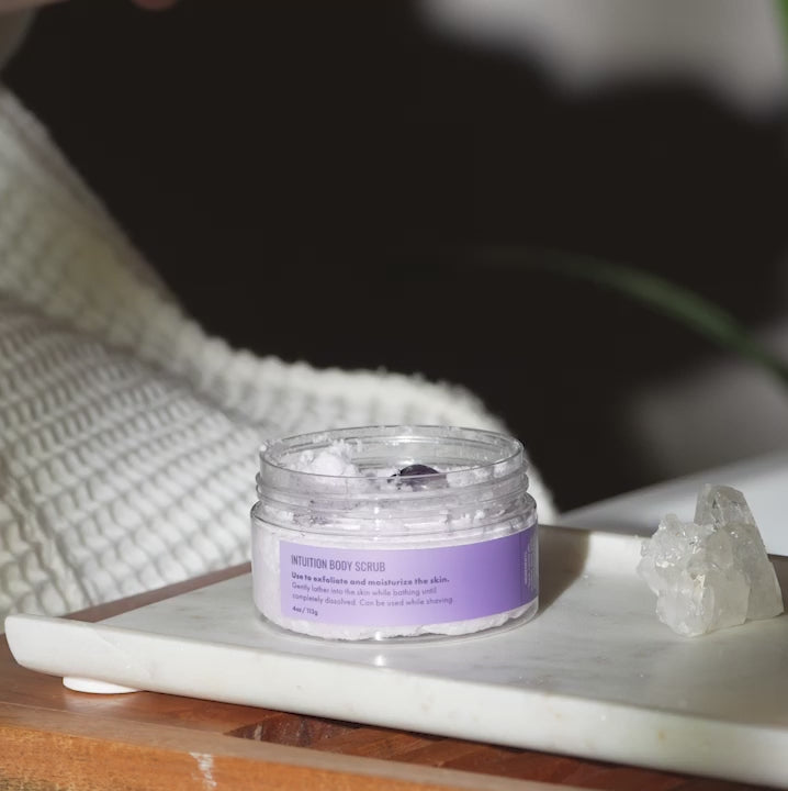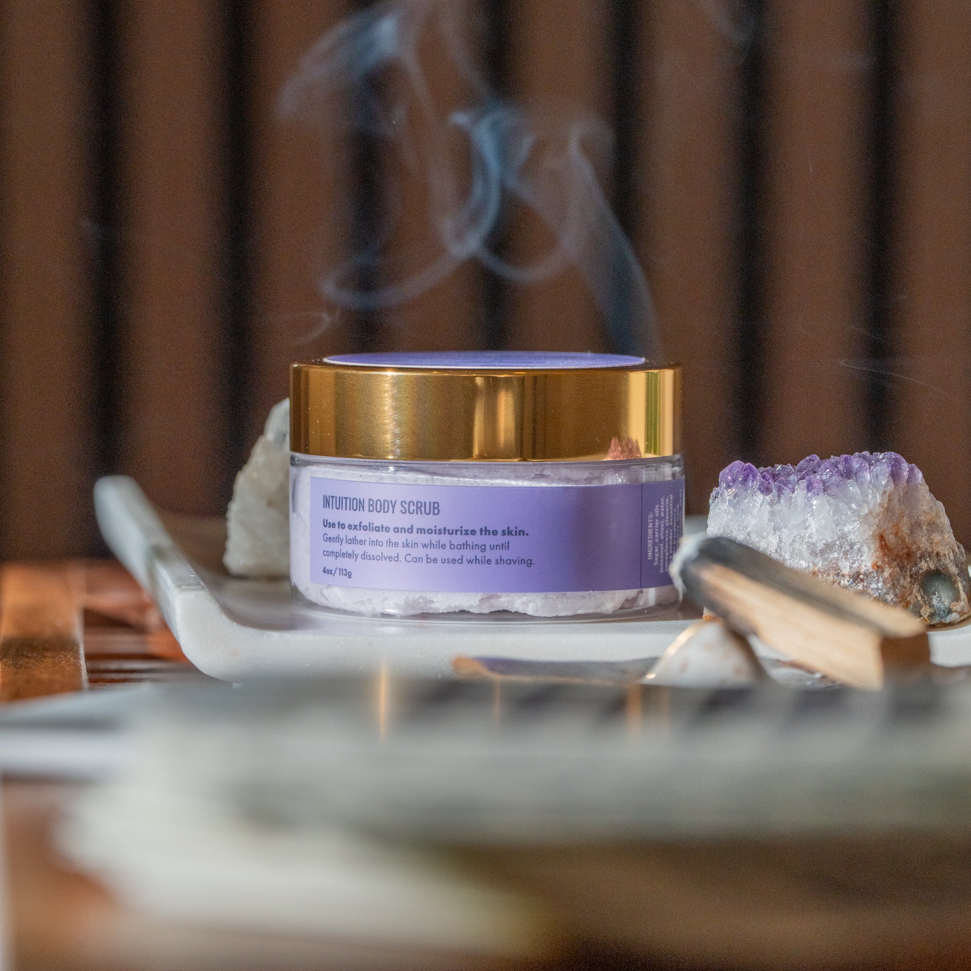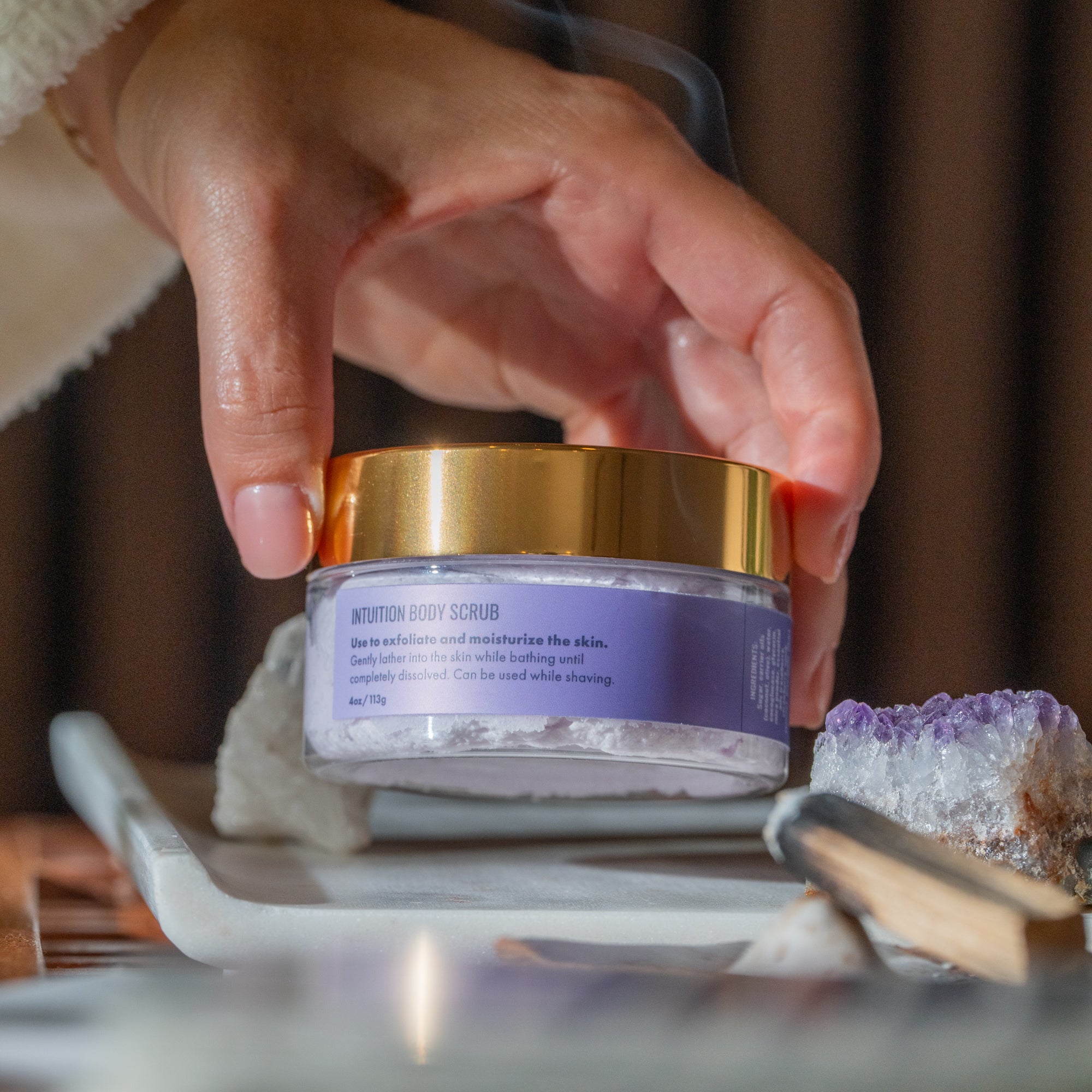 Indulge your senses with our Intuition Body Scrub, a luxurious blend designed to exfoliate and moisturize your skin.