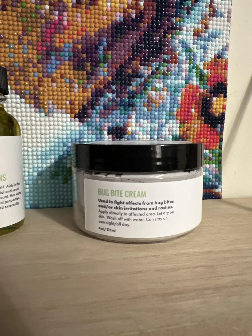 The Bug Bite Cream has many added benefits in one. This thick, cooling, lavender-infused cream soothes itchy bug bites and stings. This cream is excellent to use on irritated skin to provide comfort and relief. Bug Bite Cream is fast acting and provides nearly immediate relief while aiding in the healing of the skin. Due to the natural blend of herbs and oils, this cream is a natural bug repellent. This cream is great to keep around the house and in the first-aid bag to grab whenever you’re in need of relief.