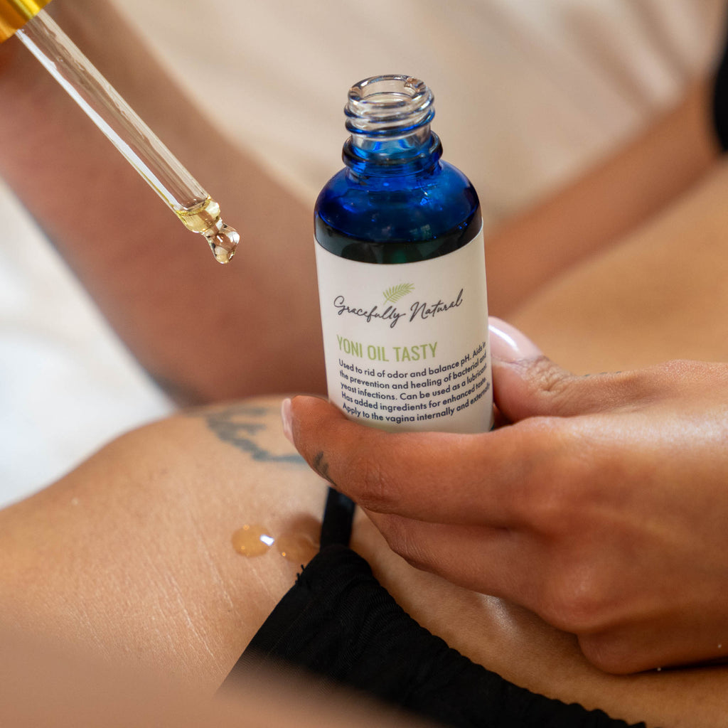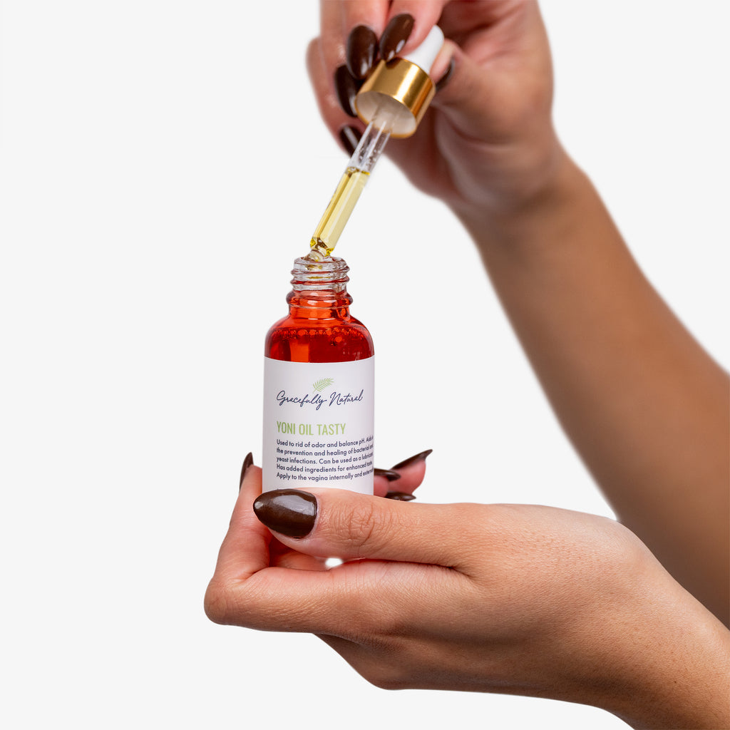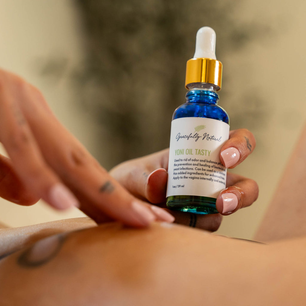 This Yoni Oil Tasty will help aid in regular maintenance of the yoni. However, this particular Yoni Oil Tasty is lightly flavored with citrus accents for additional pleasure. Gracefully Natural is known for its all-natural products; therefore, this Yoni Oil Tasty was delicately made to ensure all of the same great benefits would still be included in this edition. This includes moisturizing, lubrication, anti-fungal, and anti-bacterial properties. Yoni Oil Tasty will not only have all the great benefits of the original Yoni Oil but a tasty tang as well!