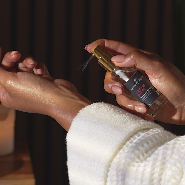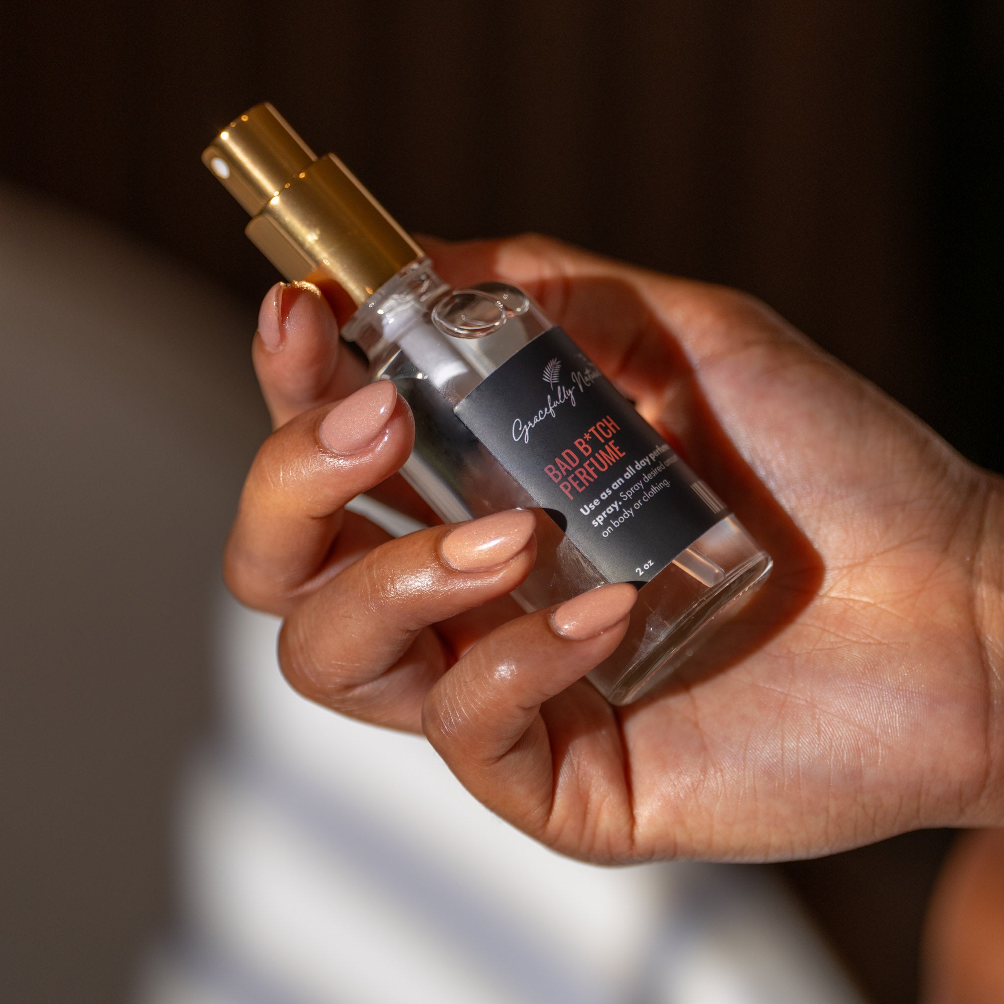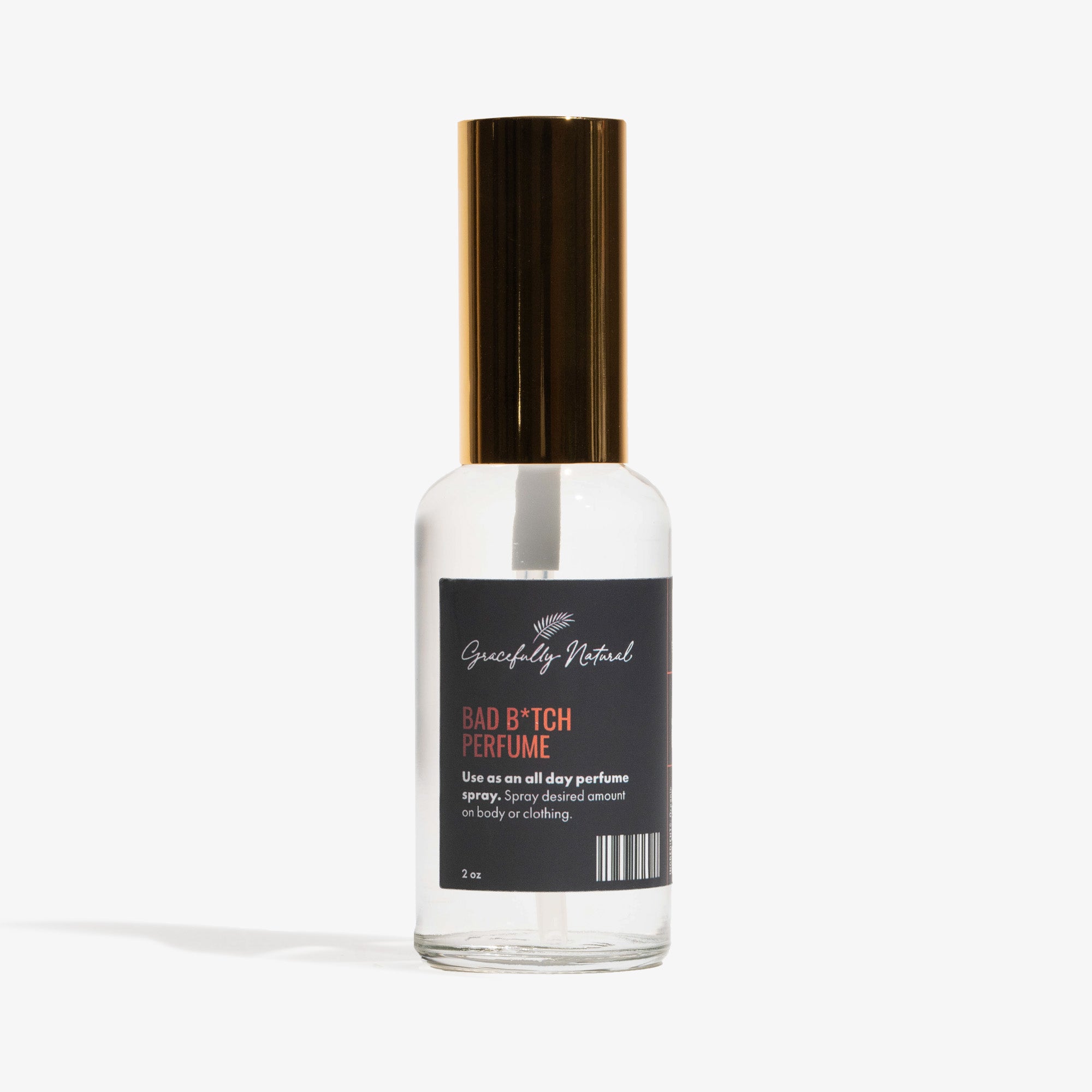 Unleash your inner confidence with Bad B*tch Perfume. This luxurious fragrance blends zesty grapefruit, soothing vanilla, warm amber, and rich sandalwood, creating a scent that is both bold and captivating.