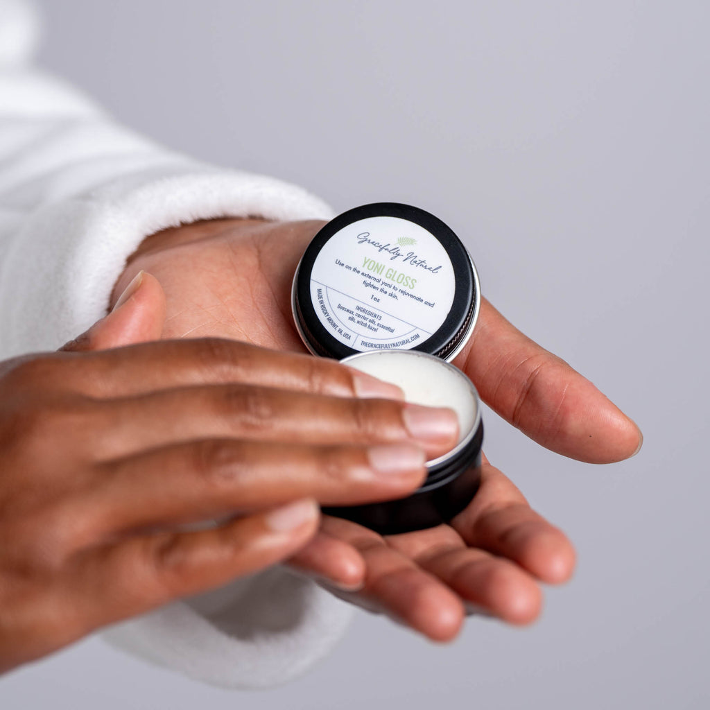 Yoni Gloss can be used to help rejuvenate and hydrate vaginal dryness due to menopause, breastfeeding, childbirth, or other conditions. Yoni Gloss is also the best to help alleviate swollen tissues or vessels accompanying hemorrhoids or after childbirth. Only the finest ingredients are used to produce our Yoni Gloss chosen because of their anti-inflammatory and antimicrobial properties. The herbs used to make the Yoni Gloss promote healing, reduce itchiness and pain, promote new cell growth, and help limit infection on broken skin. Regular use of yoni gloss helps to reduce irritation, itchiness, and redness of the skin around the yoni.